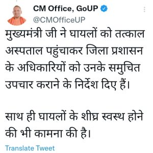 “मुख्यमंत्री योगी आदित्यनाथ ने घायलों को तत्काल अस्पताल पहुंचाकर जिला प्रशासन के अधिकारियों को उनके समुचित उपचार कराने के निर्देश दिए हैं। साथ ही घायलों के शीघ्र स्वस्थ होने की भी कामना की है”।